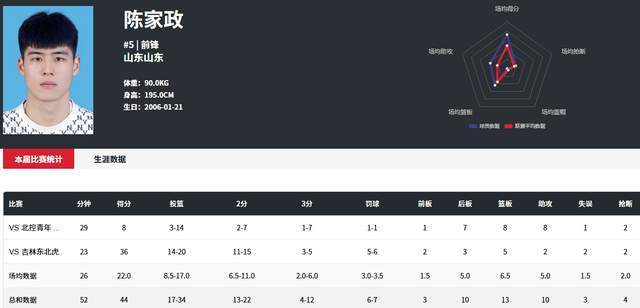 联赛还没开始,陈家政就跟着广东U19男篮先去打青年联赛,也是一种锻炼提升。在首场比赛14投3中,状态低迷,只拿到8分8篮板8助攻的局面下,第二场对阵吉林队的比赛,陈家政就爆发了。他打了26分钟,20投14中,其中三分球5投3中,罚球6罚5中,独砍36分5篮板2助攻,终于找回了自信。