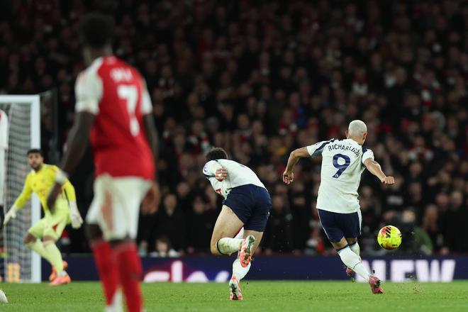 在阿森纳与热刺的北伦敦德比第55分钟,阿森纳中场苏比门迪在中场带球,面对包夹时有些托大,被帕利尼亚从侧向抢断,里沙利松看到拉亚的出击位置后直接起脚吊门,皮球越过匆忙回追的拉亚,极限入网,这粒神仙球一度帮助热刺缩小分差!