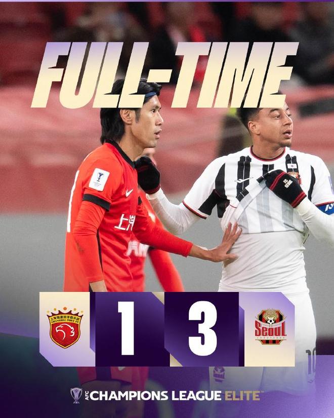 在完成中超三连冠之后,上海海港主场1比3负于首尔FC,本赛季5场亚冠取得1平4负的成绩,在东亚区垫底。随后出战的成都蓉城精英尽出,但也仅以1比1的比分战平广岛三箭。